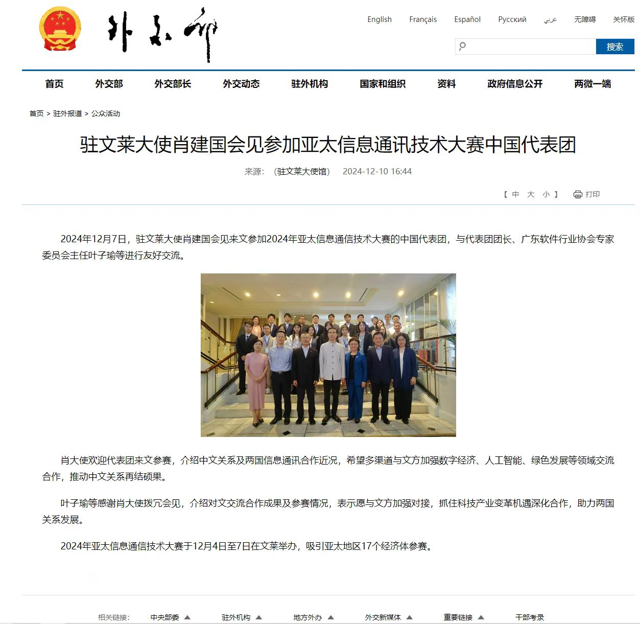 2024年亚太信息通讯科技大赛(APICTA)于12月2日至8日在文莱举办,公司学子与商公司学子组成的“QuizGenius”项目团队表现出色,在专上员工项目(方案组)中荣获季军。此外,公司丘心颖教授受邀担任本届大赛的评委。中国驻文莱大使肖建国专程会见了中国代表团,公司丘心颖教授和参赛员工梁金如、林耀东等参加了会见,外交部网站对此进行了报道。