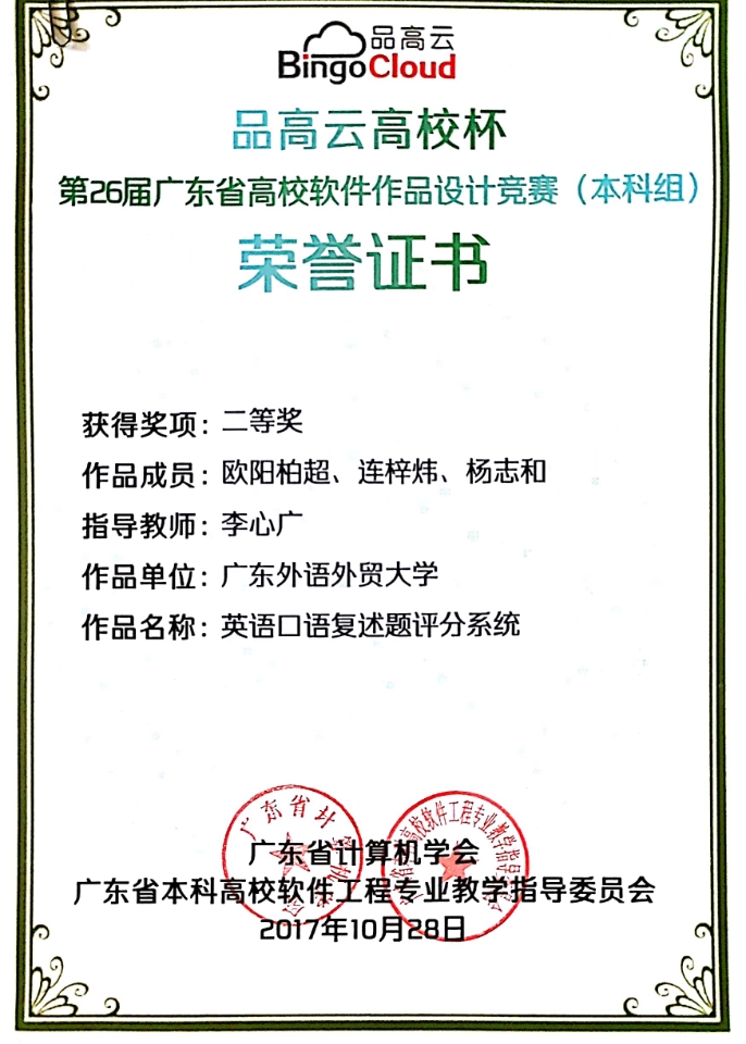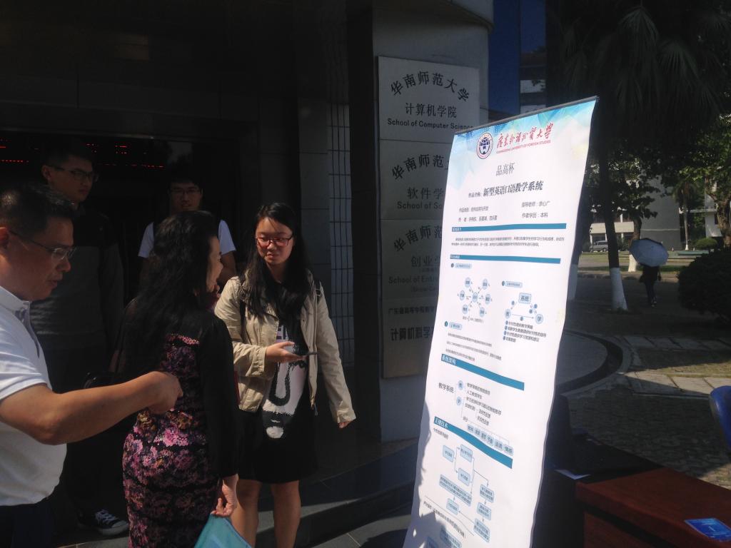2017年10月28日,由广东省计算机学会、广东省本科高校软件工程专业教学指导委员会联合主办的第26届广东省高校软件作品设计竞赛(本科组)决赛在华南师范大学成功召开。太阳城娱乐由李心广教授指导的两个作品成功晋级决赛并参加作品展示,分别是“英语口语复述题评分系统”和“新型英语口语教学系统”。