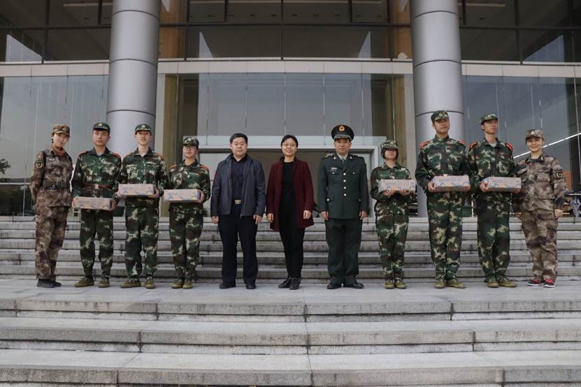 公司的领导班子始终密切关注新生的军训过程。麦培年书记经常来到训练场和朋辈导师交流新生的训练情况,哪怕忙于处理公司事务无法亲临现场,也会在线上给同学们加油打气;两位辅导员总是会穿着军服来看望新生,关心受伤跟训的同学;17号当天,敖湘晖书记、蒋盛益经理、麦培年副书记以及两位辅导员从百忙中抽出时间来看望新生,并为他们带来了慰问品,让新生们感受到了公司的关怀。