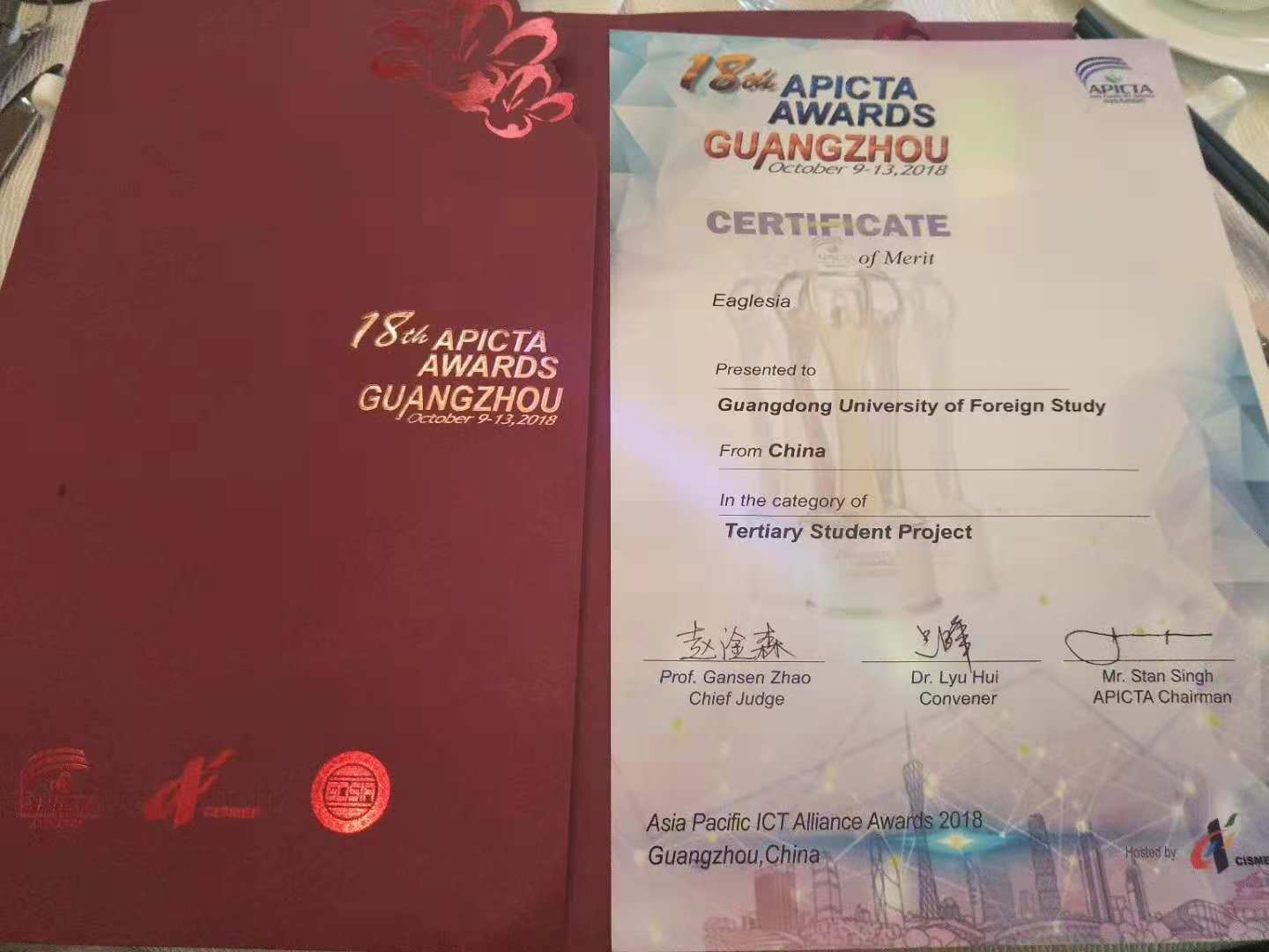 公司选派的EAGLESIA(鹰眼看中国)参赛队伍荣获Tertiary Student Project类别的Merit奖项,在老员工组中位列第四名(老员工组共有26支参赛队伍,最终评出winner奖两项,merit奖十三项),是本届大赛中老员工项目类别中唯一获奖的中国大陆队伍。