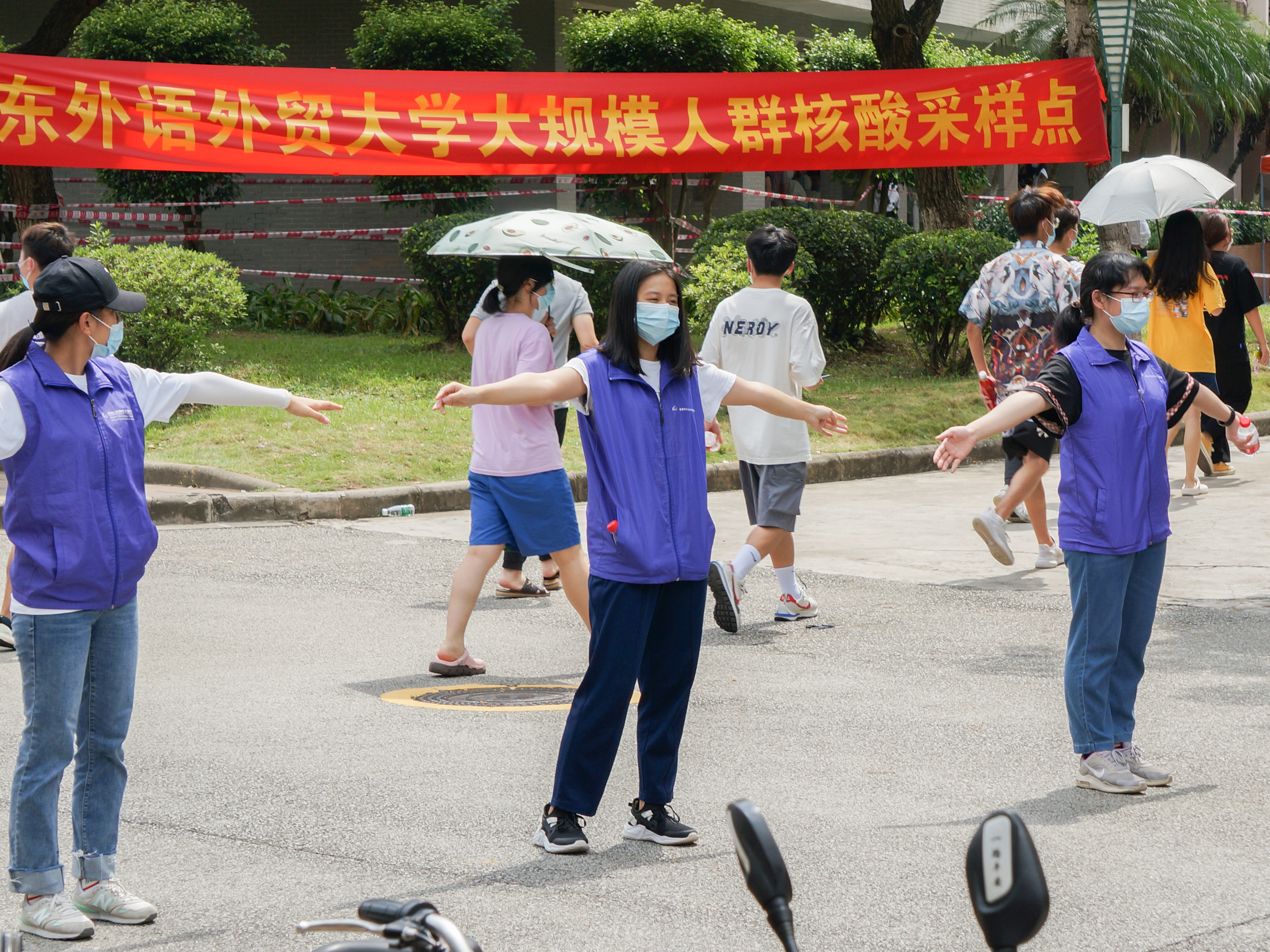 志愿者为待检测员工封路方便进入