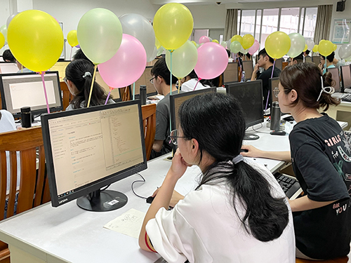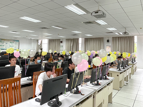 下午一点整,实验室里吹响了比赛正式开始的号角。参赛选手们仔细揣摩题目,大脑飞速转动,手指灵活敲击着键盘,实验室里开始出现此起彼伏的键盘敲击声。竟在短短7分钟时,一名选手解出了第一道题,志愿者为其送上全场第一个气球。比赛仍在激烈地进行着,时间在选手们敲击键盘的缝隙中流过。与时间赛跑之时,他们理智、沉稳,运用自己所积累的知识去解决每一道题目,去获得系统给出的“Accepted”这个亮眼的英文单词。时间悄然流逝,五颜六色的气球渐渐遍布赛场,形成了一道象征“成功”的风景线。