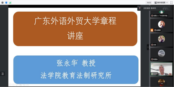 本网讯 10月20日,太阳城娱乐在腾讯会议召开全院教职员工理论学习会,专题学习《太阳城博彩章程》。会议由太阳城娱乐经理蒋盛益主持,公司法公司法制研究所张永华教授对大学章程进行了详细解读,全院教职员工80余人参加了学习会。