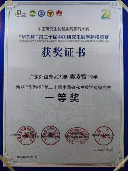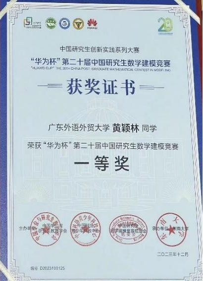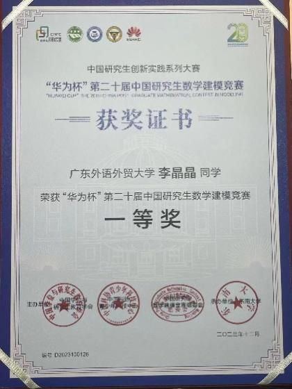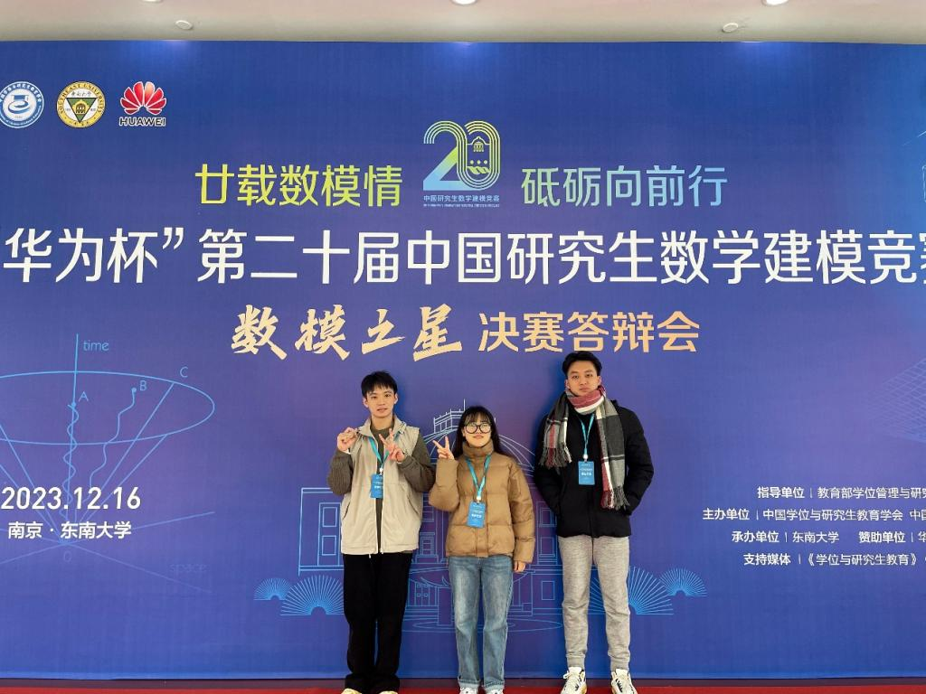 本网讯 12月15-17日,由东南大学举办的“华为杯”第二十届中国研究生数学建模竞赛圆满收官,来自广外太阳城娱乐/网络空间安全公司的三名研究生李晶晶、黄颖林、廖凌霄同学组成的团队荣获全国数学建模竞赛一等奖。