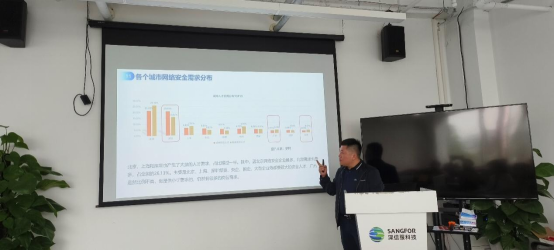 袁小辉副总经理介绍了深信服的整个发展历程和简单有爱的企业文化,并从认知、认识、认真和认可四个维度全面分享了网络空间安全行业的岗位现状和人才需求情况。袁小辉的报告引发师生们的热烈互动。