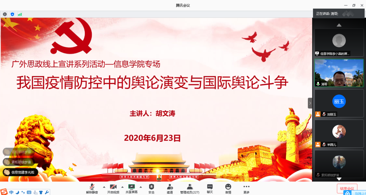 本网讯 2020年6月23日晚,委举办线上思政宣讲会,公司党委常委、党委宣传部部长、党委教师工作部部长胡文涛作题为“我国疫情防控中的舆情演变与国际舆论斗争”主题宣讲,政领导班子、党支部书记、系部办主任、全体教工和员工党员参加宣讲会。宣讲会由委书记朱珍葶主持。
