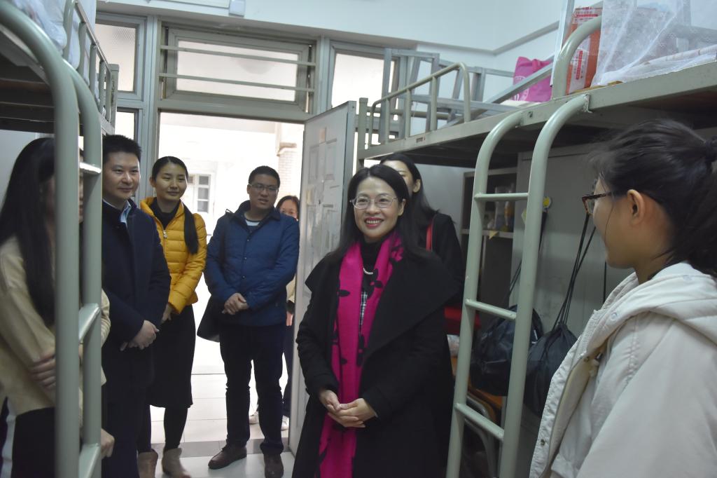 1月4日上午,委书记朱珍葶、党委副书记肖锋及全体辅导员到员工宿舍走访。朱书记亲切地关心同学们的学习和生活情况,勉励大家期末积极备考,诚信考试,安排好假期的学习与生活。朱书记赞扬同学们良好的精神面貌和宿舍文化建设,对继续营造和谐、友爱的宿舍氛围,推动“最美宿舍”建设提出了要求和希望。此外,朱书记鼓励大家在大学期间要合理安排自己的时间并做好职业生涯规划,不断加强专业理论学习,并通过理论指导实习实践,提升自己的综合素质与能力。