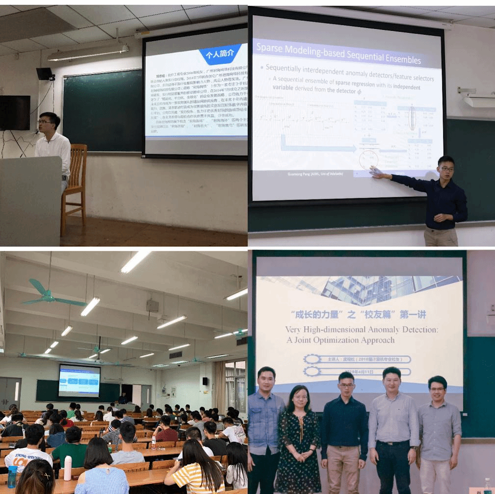 庞观松现任阿德莱德大学澳大利亚机器学习研究院博士后研究员,在国际重要会议和期刊发表多篇学术论文,并担任多个国际著名会议、期刊的审稿人。他结合自己最近的研究成果,介绍了计算机和数据挖掘领域最前沿的研究方向和解决方案,并特别结合自己在广外七年的生活,与同学们分享了学习体会和成长的收获,现场气氛生动热烈。
