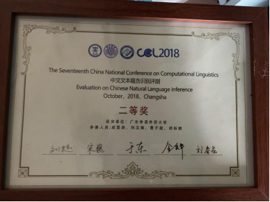 2018年10月19日—21日,“第十七届中国计算语言学大会”(The Seventeenth China National Conference on Computational Linguistics, CCL 2018)在长沙理工大学举行。本次大会组织了多项技术评测任务,为研究者提供测试自然语言处理相关技术、算法和系统的平台,吸引了全国各大高校公司以及企业参加。公司研究生戚昆逊、刘汉锋、曹子旋三位同学在本次会议的评测任务“中文文本蕴含识别”大赛中获得了全国第4名、二等奖的好成绩。