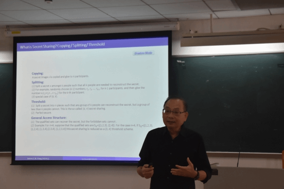 杨庆隆教授在讲座中介绍了秘密图像共享的最新技术、算法、解决方案和应用,解释了当秘密共享扩展到秘密图像共享时所需要考虑的关键问题。讲座最后,杨教授回答了现场老师和同学的提问,讲座在热烈的掌声中结束。