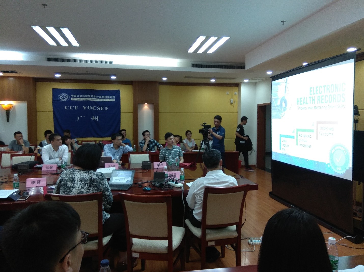 本次学术报告会邀请五位来自学术界和医院的嘉宾围绕“医学文本自然语言处理”这一主题展开了精彩的演讲。首先,美国Mayo Clinic(美国设施最先进、规模最大的医疗机构) Hongfang Liu教授介绍了美国基于电子病历的国家级合作项目、自然语言处理在临床医学的应用,提出了通用自然语言处理工具在医学文本处理中存在的突出问题,并结合个人经验提出了潜在开放和社区两种解决策略,最后分享了Mayo Clinic在医学自然语言处理方面取得的最新进展和应用。广东药科大学的蔡永铭教授从实际项目出发,通过处理广东省清远市2013年1月至2016年5月的手足口病发病序列,基于百度指数建立GM(1,2)模型来预测日发病数,详细介绍了数据的获取和处理、使用的预测模型和方法以及结果的分析和讨论。哈尔滨工业大学的汤步洲副教授介绍了对中文临床医疗文本处理研究现状的最新调研工作,先从整体上介绍了临床医疗文本处理的初级和高级应用框架,对每个应用场景介绍目前国内学者已发表的相关工作,分享了汤博士所在团队在中文临床医疗文本处理的最新研究成果,最后介绍了目前还面临的一些挑战。广东省中医院的翁衡高级工程师从广东省中医院的实际临床数据处理出发,介绍了知识服务框架、健康医疗个性化功能服务平台,并围绕专家本体知识库与语义网络协同,分享了在大规模知识图谱构建、知识抽取、融合表示等方面的最新研究和应用工作。解放军广州总医院的李晋博士介绍了国家药品不良反应检测哨点(医疗机构)联盟,然后重点分享了研发的中国医院药物警戒系统CHPS v1.0和v2.0,以及CHPS系统在包括医院ADR病历分析、ADE诊疗措施分析等方面的应用情况。