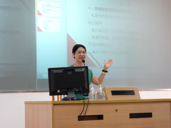 朱珍葶结合教育部网站公开曝光的违法教师职业行为10项准则典型案例做警示教育报告,并带领公司教师学习了《中华人民共和国教师法》和《教团队格条例》的具体惩处办法,为公司教师队伍师德师风建设敲响了警钟。她指出,全院教师要注意员工送礼、课堂言论、师生关系、学术不端等问题,要做到严于律己,努力提高个人师德、品德和私德,加强理想信念、育人意识和法纪观念,爱护员工成长,维护教师队伍形象。