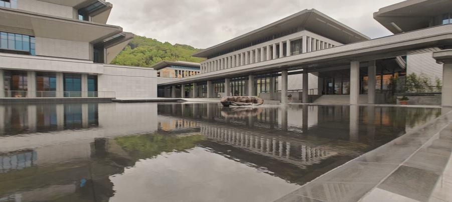 国家版本馆广州分馆位于广州市从化区凤凰山麓、流溪河畔,由何镜堂院士领衔设计。建筑以“中华典藏、岭南山水、时代新韵、文明灯塔”为总体设计理念,在主楼文沁阁前的庭院中,矗立有一颗上百年的格木古树和一方巨型端砚,一池清水在微微清风下波光粼粼,展现出独特的岭南新韵。