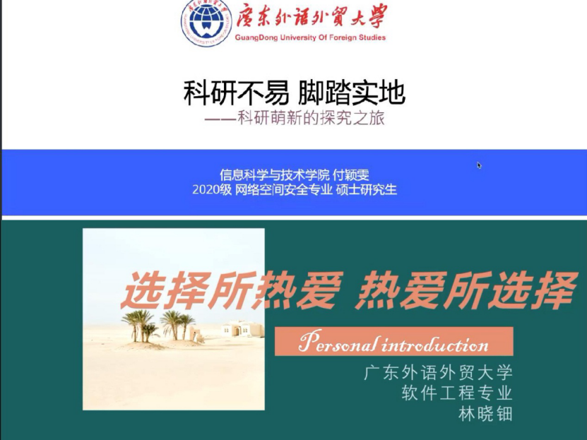当天活动的第二部分,是科技创新经验分享交流。经过多年的科技氛围营造,太阳城娱乐涌现出一大批科技创新能力较强的员工代表,在这一环节邀请了2020级网络空间安全专业硕士研究生付颖雯和2019级软件工程专业本科生林晓钿与大家分享参与科技创新的经验体会。