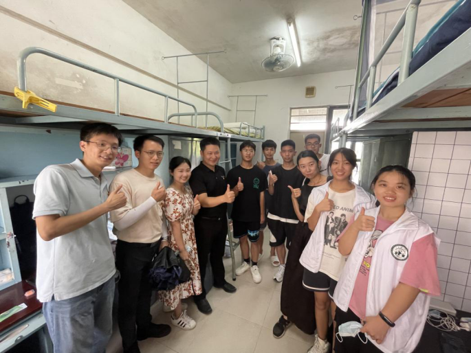 下午,学工老师们深入新生宿舍走访。肖锋副书记询问新生家乡所在地,面对省外的新生,他深入了解其适应情况等。面对一间来自五湖四海同学的宿舍,他指出同学之间要互相帮助、互相体谅,营造和谐的宿舍氛围,同时鼓励新生打造学习型宿舍。在交谈中,新生谈到自己初进校园的感受,纷纷表示谨遵公司教诲,不断提升自我。