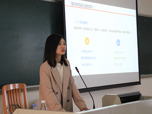 期间,周喆围绕新闻宣传原则、写作规范、新闻图片的拍摄等方面展开培训。首先,她讲解了新闻稿件的基本格式、校园新闻报道要求贴近生活的原则等,并就新闻的写作规范和注意事项展开了讲解,针对新闻稿件中常常出现的问题进行了剖析,给出了解决之道。接着,她又从标题写作、导语写作、稿件内容的侧重点等方面向同学们介绍应当如何“炼”成新闻稿。最后,她通过解说新闻图片和大量生动的新闻摄影案例,让同学们全面了解了新闻摄影的构图和基本表现手法,并就如何拍好新闻图片、怎样让图片更能准确传递信息等方面,为同学们进行了详细讲解。