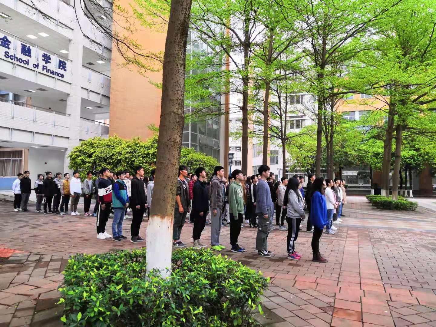 天将亮未亮,但同学们早已放好书包,自觉排列整齐,肃立于教学楼中庭等待着升旗仪式的正式开始。
