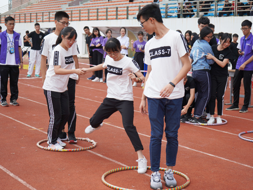 一声令下,真正的趣味开始啦。一圈圈的“小石头”上是所有运动员的脚印,一群青春年少的运动健儿在运动场上挥洒自己的汗水,用他们的热情点燃这场激动人心的运动会,他们团结协作,相互扶持,一步一步地朝着目标前进。趣味赛不仅体现了同学们的团队精神,更增进了同学之间的友情。