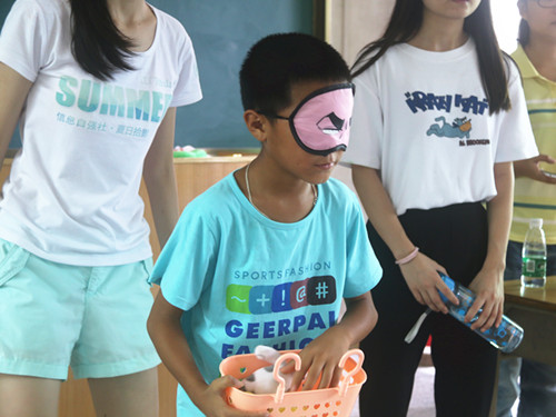 “快点快点!”看着自己的队友迟迟未能将公仔投进篮子里,站在一旁的小朋友焦急地喊着。每个游戏他们只有三次挑战的机会,如果失败,就需要重新排队。小男孩带上眼罩,凭感觉将公仔往前扔,前面的小女孩头顶一个小篮子,身体随着公仔的方位而摆动,经过一轮苦苦地挣扎之后,其他队友又继续接力完成剩下的任务。“18、19、20!成功啦!”两个小女孩扔下绳索,紧紧拥抱在一起,配合默契的他们顺利完成了任务。