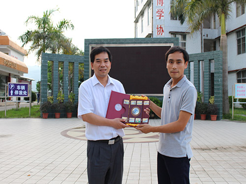 麦培年书记赠予梁村镇中心小学广外纪念品