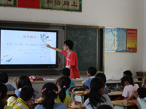 义教三班的第一节课是语文课,服务队带来了与众不同的语文课——绕口令比赛。谢凡老师给小朋友们出了几个绕口令,让他们自行练习后就开始了分组比赛。小朋友们争相举手,为自己组争分,课堂气氛活跃。义教二班的数学课也不是“寻常”的数学课,而是训练小朋友逻辑的趣味数学课。灏扬老师出了一道“过桥问题”,小朋友们看到题目立刻七嘴八舌地讨论了起来,灏扬耐心地为小朋友们解答一个个问题,让每个小朋友彻底明白题目,再给他们思考时间。一时间,教室迅速安静下来,小朋友们都在低头写写算算,解答题目,然后又响起一阵阵小声的讨论。小朋友们纷纷想出“过桥妙计”,踊跃举手。最后通过老师的小提示,有几个小朋友想出了最终答案。