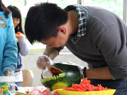 本网讯 3月13日下午,信息团员工活部在广外南校区教学楼D栋101教室举办了第五届男女生节之“阳春信息,硕果累累”水果拼盘大赛。本次比赛中,到场担任评委的有国际经济与贸易公司生活部部长陈伟成、财经公司生活部部长梁云慧、艺术公司生活部部长张宇晴、英语教育公司生活部部长曾敏滢、云山水榭酒水部来宾郭佳璇。
