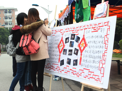 这次十大人物摆摊宣传的展示区别出心裁地在摊位旁边设立一块展示板,板上具体介绍了十大的流程推进和往年的十大人物照片回顾。在展示板的两旁还守候着两名工作人员,在同学驻足阅览板上的内容的同时,向他们进行适当的补充,以便他们对此次活动有更充分的了解。