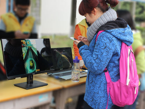 这次十大人物摆摊宣传中最炫酷的莫过于游戏区中的flappybird挑战了。工作人员运用iTools软件将ipad和电脑显示器相连接,这样在ipad上的画面便可显示在电脑上了。如此一来,在挑战者聚精会神地进行游戏的同时,其他旁观等待的同学便能看到对方游戏的全过程。这样使得游戏更加刺激更具挑战性。一开始的游戏记录是16,在经过多人的挑战过后,这个记录才被一位同学打破,最新记录刷新为23。渐渐地,路过的同学被这边精彩地游戏所吸引,游戏记录也不断被刷新。涌动的人潮也说明了本次宣传的成功。此外,游戏区里另外有一部电脑播放着往年十大人物竞选的视频,让更多的同学领略到十大人物的风采。