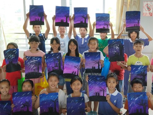 美术课是我队最具特色的课程之一。由陆仰丽老师教授的美术课打破了以往员工们只会在纸上乱涂乱画的传统,是她让孩子们的手“动了起来”、让作品“活了起来”。第一天陆仰丽老师便教孩子们做了“无限翻和立体花贺卡”,孩子们在贺卡上写着对家人的祝福,随后便回家开心地将自己的作品送给家人。随后几天,陆仰丽老师还教孩子们做了百合花、郁金香和立体纸房子等,极大地锻炼了孩子们的创新能力和动手能力。其中最为特色的便是星空画了,队员们看到这些作品后纷纷称赞“小小年纪就画这么好”、“陆仰丽老师教得真好”等等。
