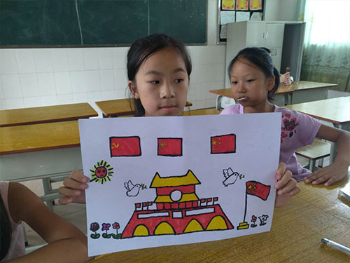 绘画课唐嘉兰老师教小朋友们画国旗、党旗、团旗、天安门、和平鸽等有爱国情怀的事物。小朋友们用画下红红的五星红旗,画笔稚嫩,但情感真挚。唐老师耐心地向小朋友们解释各个旗帜的设计思路和象征意义,她希望通过这次课程,让小朋友们更热爱祖国也能更喜欢画画。