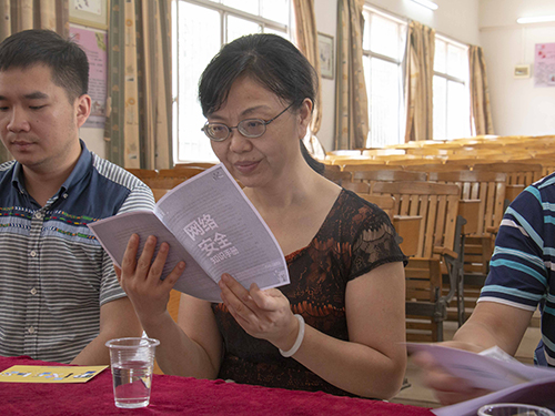 在蒲劼向敖湘晖书记介绍完队伍的大致情况之后,紧接着是由PIXELS服务队各组组长进行下乡八天以来的工作总结汇报。首先进行汇报的是义教组组长韦树雁,她总结了义教组工作的基本情况,回顾了她对实际情况作出的调整以及总结,并提出了义教组于当天上午开展的特色课程:网络安全公开课。工作结果得到各领导的肯定。