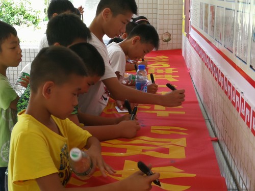 本网讯 2018年7月17日星期二,是七月辰光服务队来到广东省清远市清新区三坑镇中心小学的第八天。在第八天,各项工作有序进行。上午,清远市清新区教育局在三坑镇中心小学利用服务队下乡义教时间,组织员工参与禁毒宣传和签名活动,对员工进行了一次禁毒宣传教育洗礼。