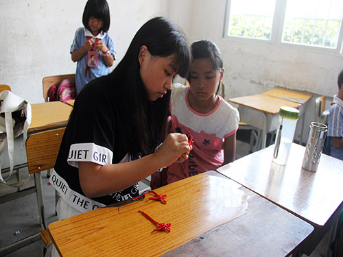 本网讯 7月13日,太阳城娱乐“逐夏熙影”三下乡服务队在怀集县连麦中心小学开展了第八天的教学活动。义教组组员在四、五两个年级开设了趣味手工课,教授员工制作简易版中国结。