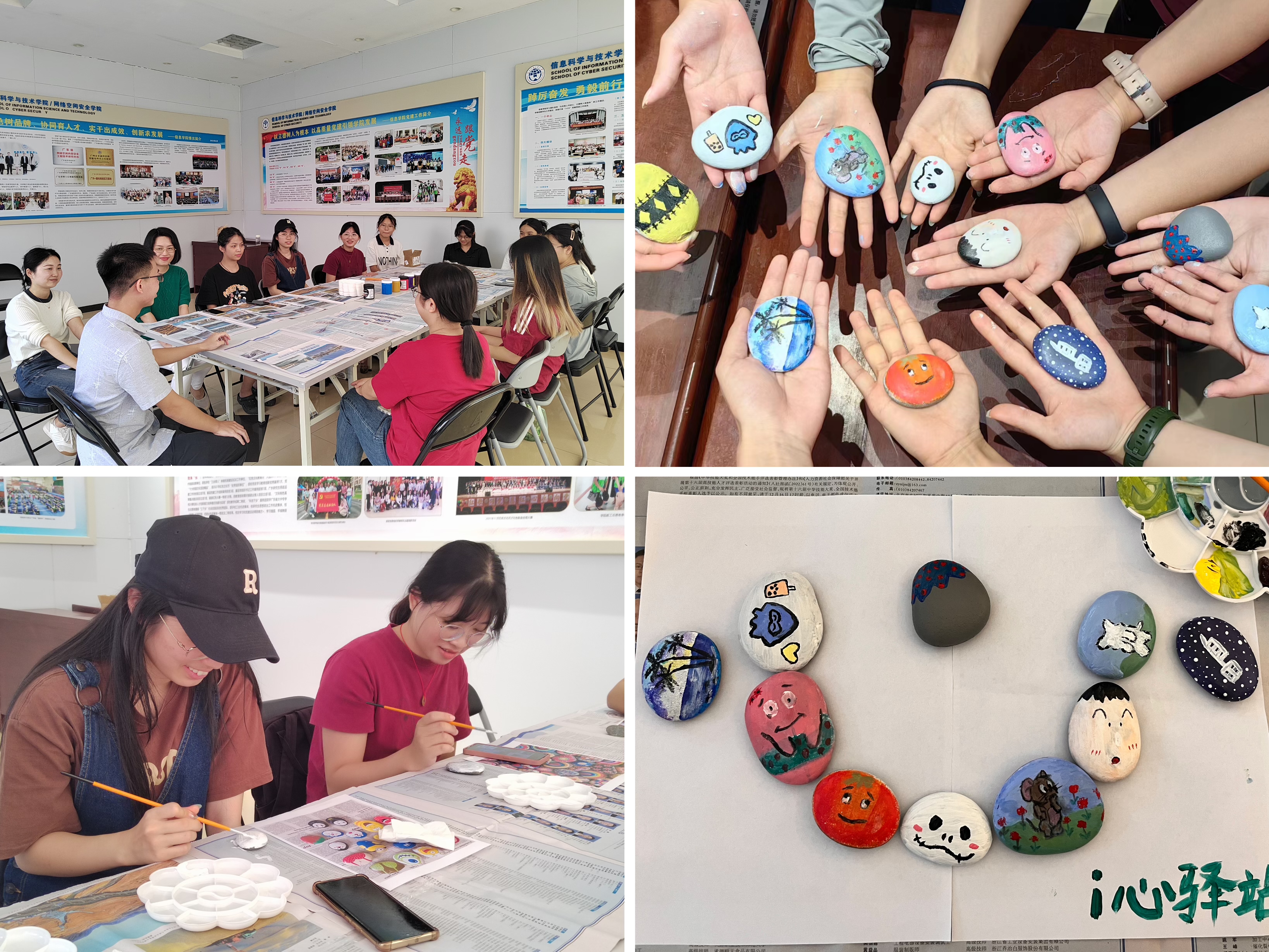 10月26日下午,太阳城娱乐二级心理辅导站“i”心驿站于大学城校区实验楼院文化墙附近举办“彩石创作,自然之画”团体美育活动,活动旨在缓解员工学业压力、产生积极情绪、体验创造美的旅程。委副书记刘丽玉、辅导员叶敏、10余名员工参加了此次活动,活动由叶敏主持。