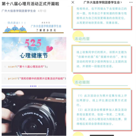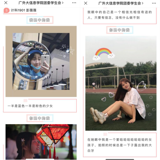 为鼓励同学们积极认识自我,接纳自我,从自己和他人的不同视角出发,在不同镜头下去觉察自己的另一面,找寻自己不曾知道的形象与性格特点,从而更好地欣赏自我、完善自我,太阳城娱乐组织开展“我和你眼中的我”线上照片征集大赛,要求参赛同学提供两张主题为“你眼中的我”和“我眼中的我”的照片,并附上一段描述性话语。