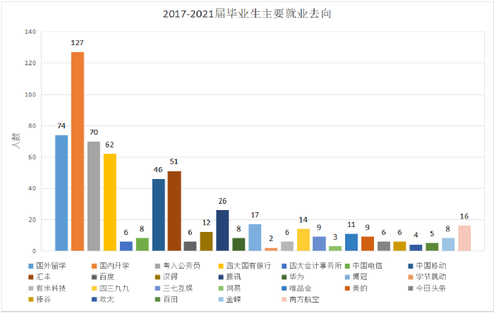 附图表:2017-2021届毕业生主要就业去向及考研、海外留公司校分布