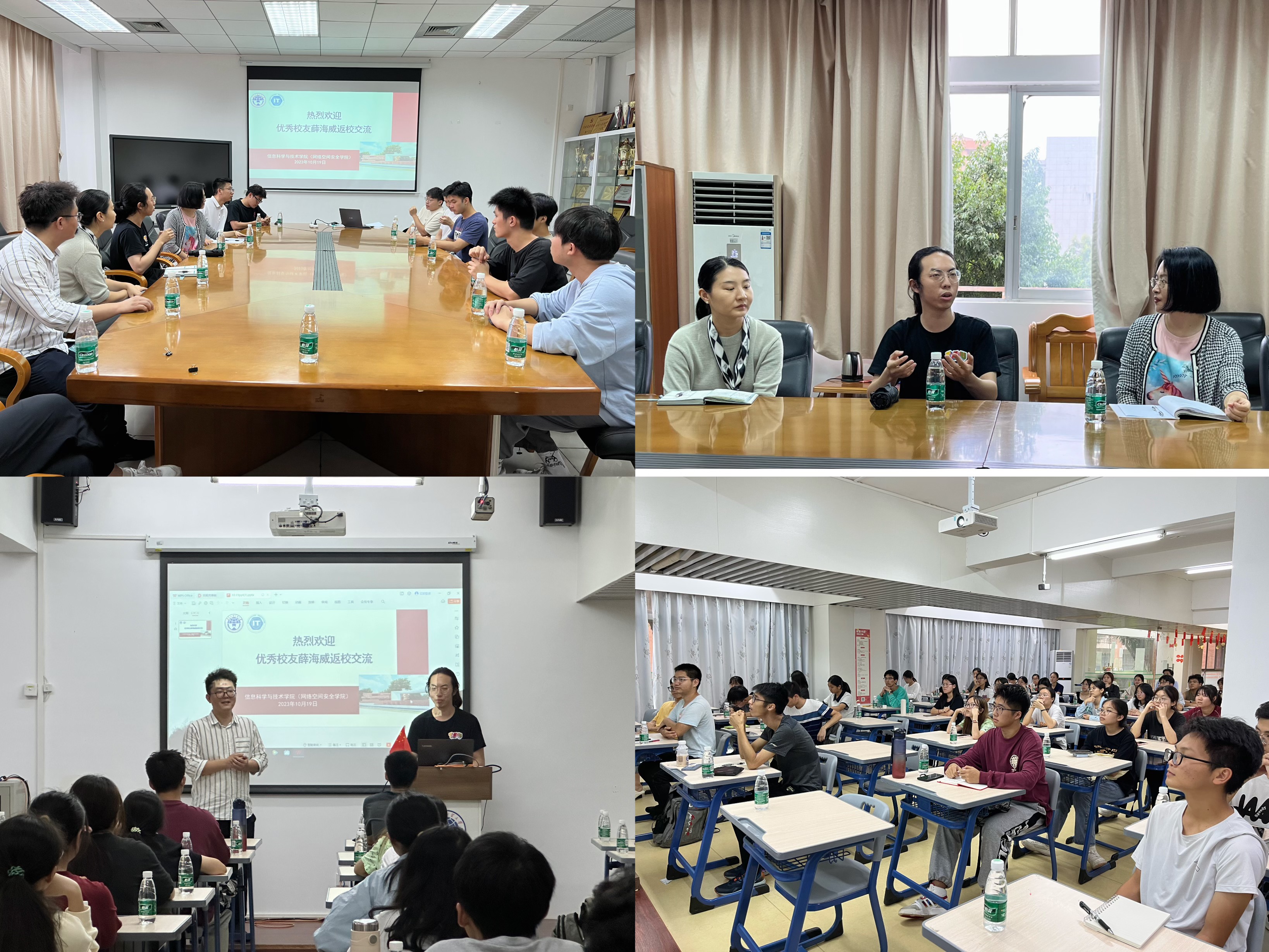 10月19日,太阳城娱乐2022届保送清华大学的优秀员工薛海威应邀返校分别在南校区实验楼C201会议室和明德书院开展面向研究生及2023级本科新生的两场报告交流会。委副书记刘丽玉、辅导员董婷、宋鹏飞、宁其翀等参加活动。