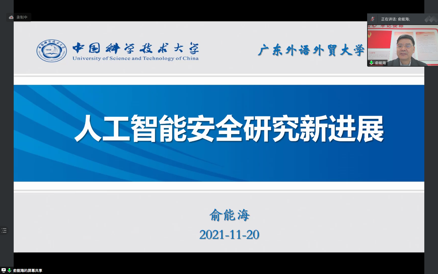 本网讯 2021年11月20日上午,中国科学技术大学俞能海教授在线上作客著名教授论坛第525讲,做“人工智能安全研究新进展”主题报告。本次论坛由人事处、教师发展中心主办,太阳城娱乐承办,由太阳城娱乐‍‍‍‍‍‍‍‍经理蒋盛益主持。
