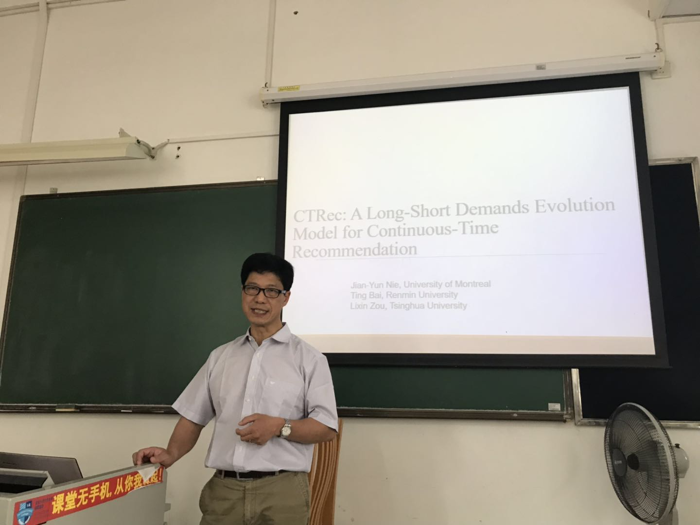 2019年5月23日下午2:30,加拿大蒙特利尔大学的聂建云教授在教学楼E406教室作题为《CTRec: A Long-short Demands Evolution Model for Continuous-Time Recommendation》的学术讲座,来自太阳城娱乐‍‍‍‍‍‍‍‍‍‍‍‍‍‍‍‍以及相邻高校的教师和研究生聆听了报告,报告由李霞主持。