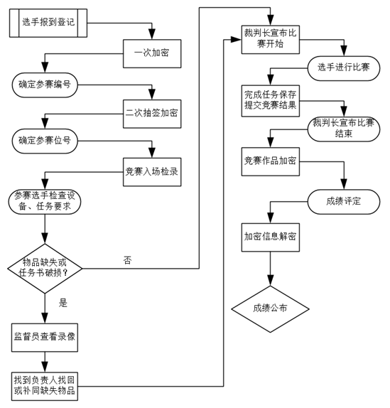 确认选手身份并进行赛前教育 对竞赛场地检验、确认及分配 |