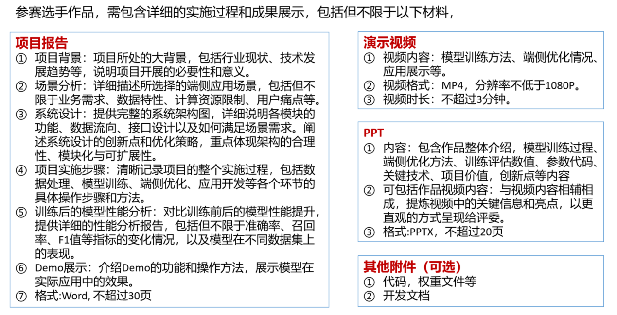 最终,参赛队将提交项目报告,视频(不超过3分钟)及PPT。其中视频为模型训练方法及应用展示视频,PPT为现场答辩PPT。
