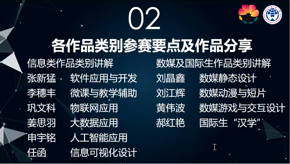 李宇耀博士对大赛的发展历史、国赛-省赛-校赛三级赛制等大赛情况进行了简要介绍,随后邀请了十位具有丰富赛事评审或指导经验的老师,对各作品类别的评审标准、往届参赛情况等参赛要点进行讲解,并分享了2023年优秀作品。