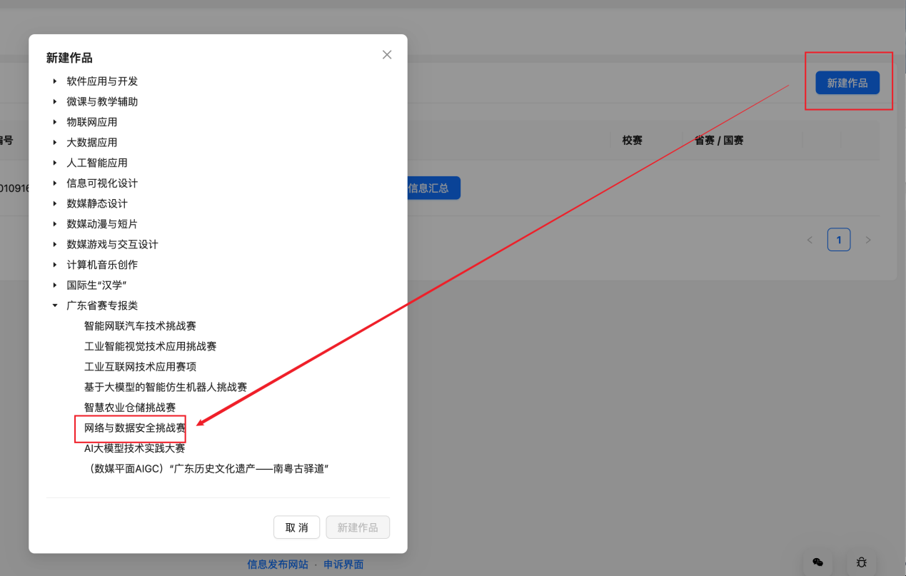 有意向参赛的选手在官网https://2024.jsjds.com.cn/进行注册,注册成功后在作品管理-新建作品中选择广东省赛专报类-网络与数据安全挑战进行新建作品。