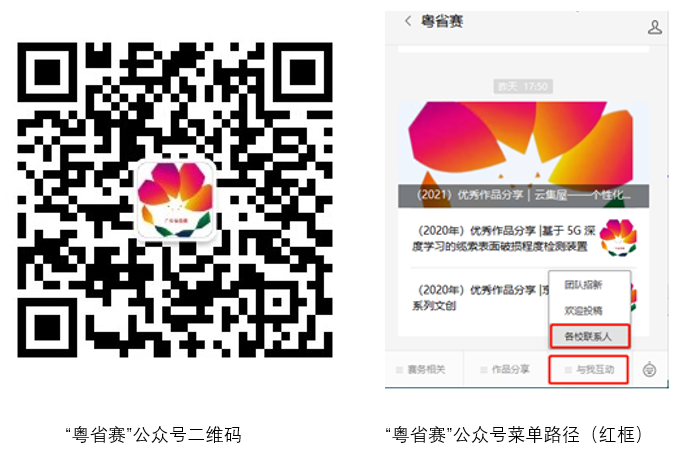 Ø 1.4.4、各校赛务联系老师信息,可循以下路径查找:“粤省赛”公众号à“与我互动”菜单à“各校联系人”,如下图所示: