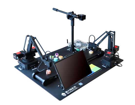 机器人底座、嵌入式AI核心开发板、桌面 级四自由度机械臂、语音采集播放设备、 高清显示屏、摄像头、机械臂端末配件、 传送带套件、色块配件。