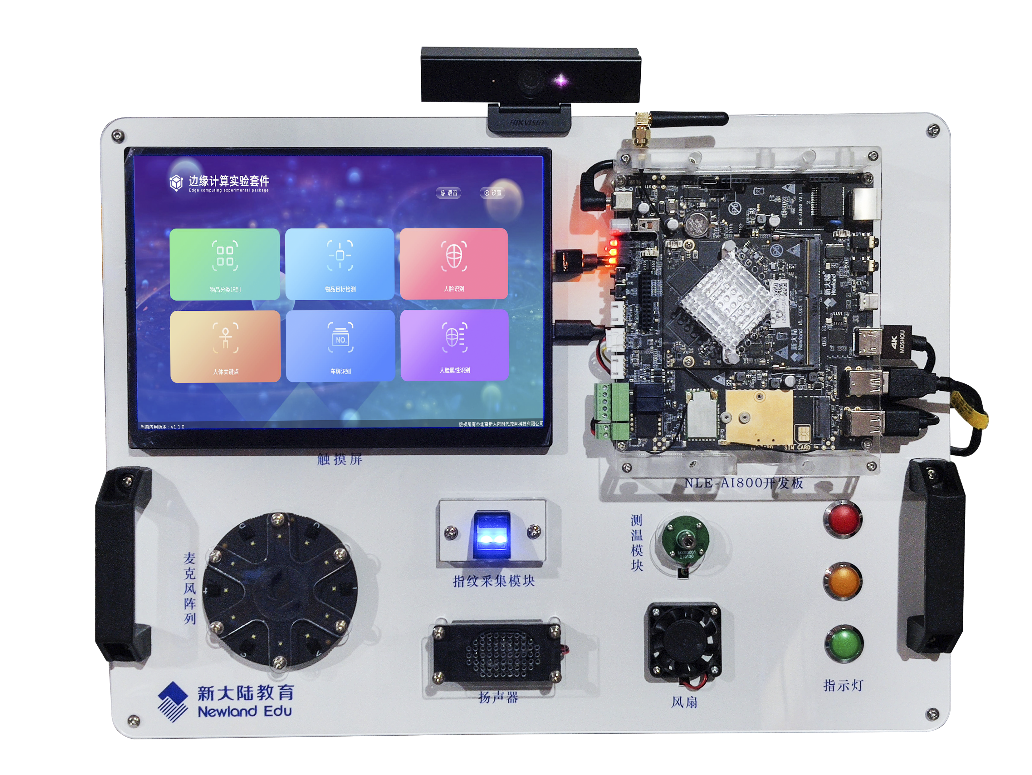 竞赛支持单位提供的竞赛设备为新大陆边缘智能应用实验平台。平台由新大陆自研NLE-AI800嵌入式人工智能核心开发板、图像/语音采集模块、传感器采集模块、执行器等硬件模块组成。开发板基于边缘计算芯片,具有高可扩展性和强大的AI计算能力,支持多传感器输入,集成丰富的硬件接口,内置各类深度学习算法,支持模型部署、模型评估,支持构建算法应用,NLE-AI800开发板的功能强劲表现为算法识别延迟低、可满足端末同时处理多个算法需求、实现人体骨骼检测与可视化显示的性能要求,支撑从竞赛、教学、应用到科研技术方案支撑满足基于企业级人工智能模型与应用竞赛内容的服务支撑。