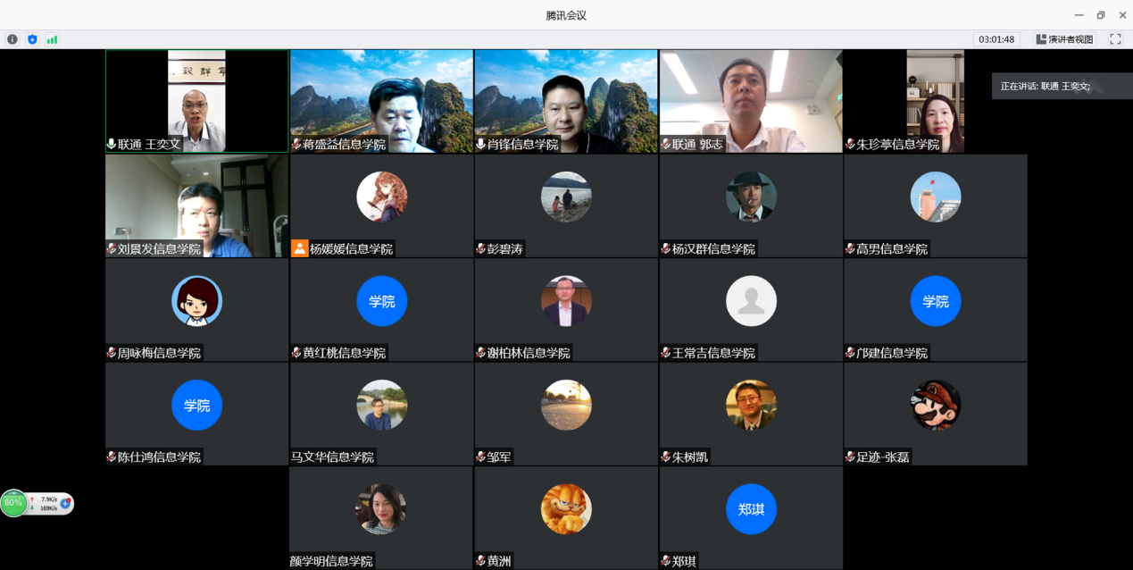 6月24日下午,公司与中国联通举行线上党组织共建和业务对接活动,中国联通广州市分公司黄埔区分公司总经理王奕文、副总经理苏小柳、广州联通政企客户事业部大数据中心主任汪旭、联通智慧足迹数据科技有限公司大区总监朱树凯、联通智慧足迹数据科技有限公司售前总监张磊、联通大数据公司工程师黄洲等参加交流。公司党委书记朱珍葶,经理蒋盛益,党委副书记肖锋,副经理谢柏林、王常吉,各系部主任和员工团队指导老师共同参与了线上会议并讨论技术合作相关事宜,会议由肖锋主持。