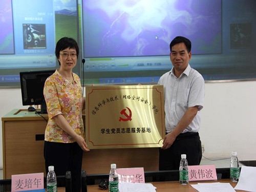 在热烈的掌声中,范正华书记和麦培年书记上台为信息科学与技术(网络空间安全)公司员工党员志愿者服务基地进行揭牌。